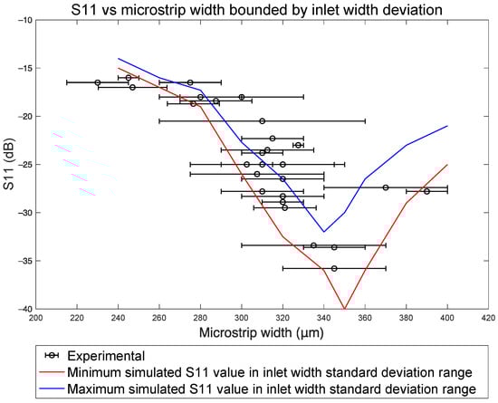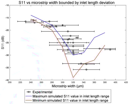To combine the effects of variation in each inlet dimension respectively with microstrip width variation, a series of simulations were performed by examining all inlet dimension values within one standard deviation of the average print-to-print value (170+/−30 μm) at successive microstrip widths, while the other inlet dimension remained constant at the designed value. The best performing S11 results (most negative) were plotted together as a lower-bound and the worst performing (least negative) S11 results plotted together as an upper-bound. The bounds of inlet width variation across microstrip width can be seen in Figure 4, and the inlet length variation bounds can be seen in Figure 5. The spacing between the two bounds in both figures illustrates that the effects of variation in each dimension are not constant across the entire microstrip width range. For example, in Figure 4, the difference between best and worst performing S11 simulation results for a 260 μm microstrip was significantly smaller than the same in bounds of a 350 μm microstrip.