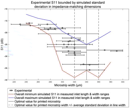 To combine the effects of Section 4.1 and Section 4.2, bounding lines were plotted using the minimum and maximum S11 values at each microstrip width for all inlet length and all inlet width combinations that lay within one experimental standard deviation of experimental averages. At each microstrip width, inlet length varied from 2.45 μm to 2.61 μm and the inlet width was varied from 140 μm to 200 μm. Upper and lower performance bounds and are shown in Figure 6 with the best-performing microstrip width of 340 μm marked by a black vertical line. The dashed vertical lines represent the average of the standard deviation in width along any microstrip in the whole experimental sample set.