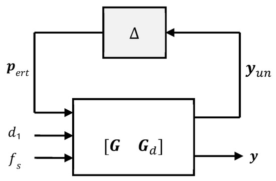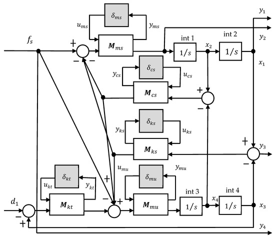 Extracting parametric uncertainties, Equation (3a–e) can be described in an LFT form as illustrated in Figure 3, in which and denote the transfer function of control input and road disturbance, respectively, and is the diagonal parametric uncertainty matrix with singular values equal or less than unity.