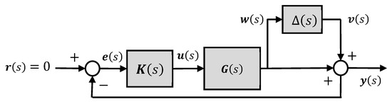 With the consideration of additive modeling errors and removing the road disturbance for simplicity, we illustrate the control system in the block diagram shown in Figure 5, in which denotes the modeling uncertainty. The transfer function between the uncertain input and output can be expressed as: