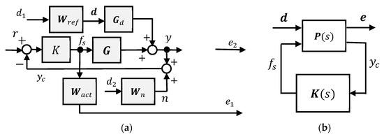 The design of the LSC controller follows a two-step procedure. First, the vehicle suspension system is pre- and post-compensated to shape the open-loop frequency response [29]. Second, the shaped vehicle suspension system is stabilized with a controller as illustrated in Figure 7a. For simplicity, several weighting functions are removed.