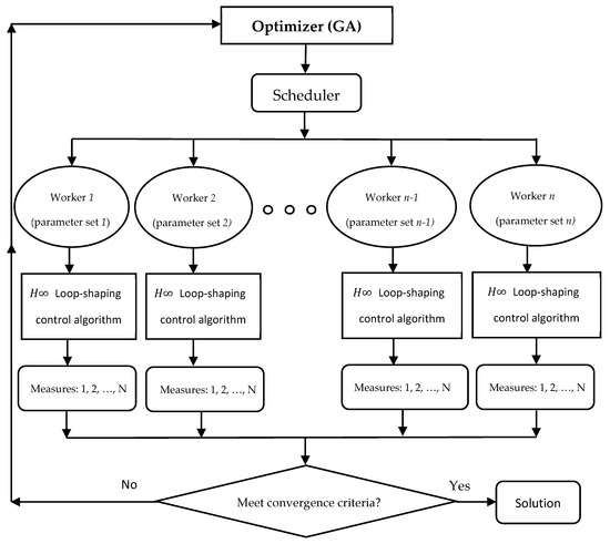 Figure 8 shows the proposed design synthesis method for robust controllers of active vehicle suspensions. This is a two-layer design optimization approach. In the design optimization of the loop-shaping controller for AVSs, all the parameters for the relevant weighting functions of the controller are treated as design variables. Initially, n sets of the design variables are randomly selected in the design space by a genetic algorithm (GA) at the top layer [30]. Considering the expensive computational loads due to the application of the GA, we use the parallel computing technique available in Matlab [31]. The scheduler parallelly sends each of the n design variable sets to the respective Worker of the parallel computing system. At the bottom layer, with a given design variable set, such as set i, the respective Worker i ‘operates’ the virtual vehicle with the LSC-based AVS under a specified testing maneuver. After the virtual testing, the required performance measures denoted by , which are acquired from the respective numerical simulation response. After the virtual test for all the Workers from , we can achieve a performance measure matrix with the size of . With the performance measure matrix, the defined constraints and the objective function are evaluated.