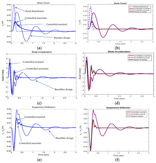 - Nominal stability and performance. The LSC controller ensures that the closed-loop system is internally stable, and the desired closed-loop responses are achieved for the nominal vehicle suspension model.