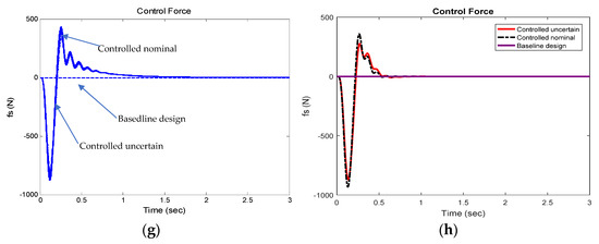 The performance of the LSC-based AVSs is compared against that of the baseline design. For the benchmark, three designs are considered: (1) the baseline design, i.e., the vehicle model shown in Figure 1 without the force actuator ; (2) the controlled nominal design, that is, the LSC-based AVS is designed with the vehicle model parameters taking the nominal values listed in Table 1 and with the application of weighting functions listed in Table 2 and Table 3 the controlled uncertain design, in which the vehicle system is modeled with uncertain parameters and the LSC-based AVS is optimally devised using the proposed design synthesis method. For simplicity, hereafter the three designs are denoted by Design 1, 2 and 3. For Design 3, 100 design cases are obtained with the maximum parametric uncertainty of for sprung mass and the maximum parametric uncertainty of for all other vehicle model parameters. The performance comparison of the three designs is shown in Figure 9.