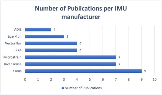 Furthermore, the Pixhawk (PX4) was the next manufacturer. It is an open-source system used primarily for flying robots as all its functions are geared towards them. The company doesn’t manufacture IMUs but assembles components. PX4 had 4 publications and one model per publication 4 in total [31,32,33,34]. Fifth in order was VectorNav (https://www.vectornav.com/ (accessed on 13 November 2020)) with 4 publications and 4 models also [35,36,37,38]. The company was founded in 2008 in the USA and deals mainly with IMU systems for aerial robots. Next was Sparkfun (https://www.sparkfun.com/ (accessed on 13 November 2020)), a retail company founded in 2003 and based in the USA. It also manufactures, among other things, IMUs by integrating individual components from third parties and presented under the company name and has 3 references for 4 models [39,40,41]. The last company on the list was Analog Devices (ADIS) (https://www.analog.com/ (accessed on 13 November 2020)) with 2 publications [42,43]. Founded in 1965 and specializes in designing and manufacturing precision electronic equipment including IMUs. The models analyzed were 11 in total.