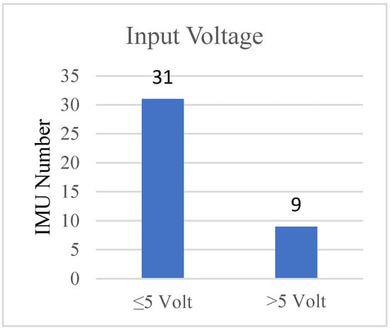 First feature examined was the input voltage. In case where there was a range of values, the average value was calculated to easily compare the results and in models with two case options (case and without case) the input voltage without a case was chosen. The Mti-10 and Mti-100 models had the highest input voltage, 21.5 Volts. The lower voltage, 2.6 Volts belongs to the ICM-20608-G and SparkFun VR IMU Breakout. The 77.5% of models had a voltage less than or equal to 5 Volts (Figure 2).