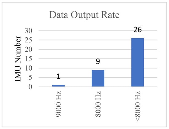 Most of the models had output data rate below 8000 Hz (26 models, 72.2%). The ESP32 Thing Motion Shield model of SparkFun had the lower value at 80 Hz. Among the others, 9 models (25%), had exactly 8000 Hz. Finally, the ICM-20948 was the only one with 9000 Hz (Figure 3).