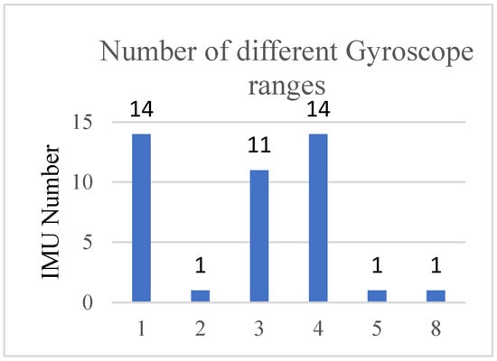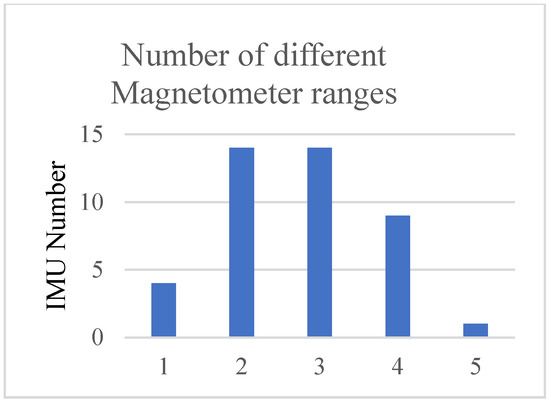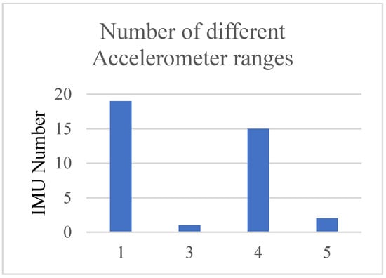 The measurement range of sensors (gyroscope, accelerometer, and magnetometer) is properly selected according to the measurements required. Some models had more than one range of values. Unnecessary measurements create problems in data transmission. The gyroscope measures angular velocity in °/s (±). The lowest value was 15.625°/s (±) at the ICM-42605 model. The highest value was 2000°/s (±). The 62% of the IMUs examined had this value at their highest range. Also, 38% have at least 4 range options (Figure 4). The accelerometer measures acceleration in g (±) where g is the acceleration of gravity. The lowest value was 1.7 g at the ADIS16362 model, and the highest was 40 g at the 3DM-GX5-10 and 3DM-CX5-10 models. 50% of all models had the highest range value 16g and the lowest 2 g (Figure 5). Finally, the magnetometer’s measurement unit is G (±) that is Gauss. Some of the data needed to be converted from μT to G. The lowest value was 1.9 G and belonged to the ADIS16448 model while the highest values were 49 G and corresponded to the ICM-20948 model. Also, 75% had up to 3 different ranges (Figure 6).