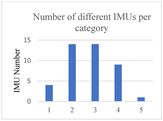 The next characteristic is structure and refers to different combinations of sensors in each IMU. The basic sensors are gyroscopes, magnetometers, and accelerometers. There are also IMUs with other sensors such as barometers, temperature, and altitude pressure sensors. The range of different number of IMU sensors varies from one to five. Figure 7 shows, how many IMUs belong to these five categories. All IMUs had a gyroscope. Even more, 90% of them had an accelerometer. 40% of them also had magnetometers. All IMUs that had a magnetometer had also an accelerometer and a gyroscope. The 38% had at least one barometer, pressure, temperature, or attitude sensor. More specifically, 43% were barometers, 31.3% were pressure sensors, 18.8% were temperature sensors and only one sensor was attitude sensor. (6.25%).