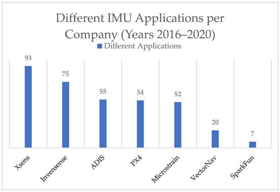 The first company on the list was Xsens (https://www.xsens.com/ (accessed on 13 November 2020)) with 9 papers and 4 different models [8,9,10,11,12,13,14,15,16]. The company was founded in 2000 in The Netherlands and specializes in the creation of motion tracking sensors. For this technology, it has created its own IMU sensors. The next company was Invensense (https://invensense.tdk.com/ (accessed on 13 November 2020)) with 7 reports and 11 models respectively [17,18,19,20,21,22,23]. The company based in California was founded in 2003 and specializes in integrated circuits with integrated sensors. Microstrain (https://www.microstrain.com/ (accessed on 13 November 2020)) is the next manufacturer with 7 papers and 6 models [24,25,26,27,28,29,30]. The company was founded in the USA in 1987 and produces sensors for industry and research.