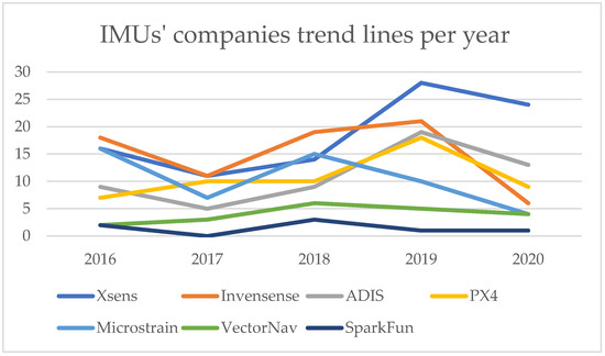 Then there was ADIS, Pixhawk, and Microstrain with 55, 54, and 52 distinct applications respectively which corresponds to a total of 45%. Finally, there were Vector Nav and SparkFun with much smaller percentages, 5.62%, and 1.97% respectively. Also, Figure 9 shows the same data broken down by year to highlight the trend of each company and the usage trends of IMU companies per year. Bearing in mind in 2020 that, on one hand, the date on which the report was written was not nearly at the end of the year, and on the other hand, that in 2020 there is a health crisis with the COVID pandemic and all areas such as global research has been affected [44]. This can be seen also from Figure 9 that all companies from 2019 to 2020 showed a decline. In case, taking into account the year 2019, the companies Xsens, Invensense, Pixhawk, and ADIS had an upward trend, while Microstrain, VectorNav, and Sparkfun had a downward. The largest increase is presented by the company Xsens, which managed to surpass Invensense, which also had an increasing trend but at a slower pace.