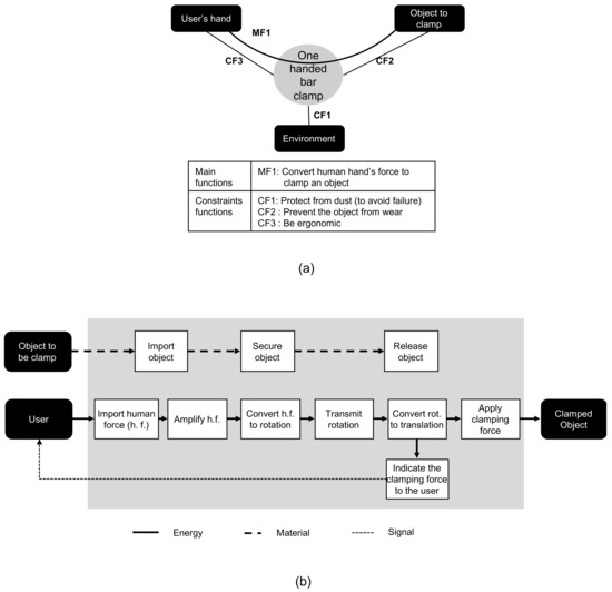 Clamp’s functional analysis. (a) External functional analysis; (b) Functional decomposition.