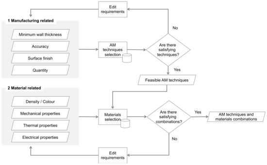 A number of studies have been carried out about AM process selection for parts [53,54]. As this aspect is not the core of our proposal, we elected to build on previous work addressing this issue. This preliminary technique selection is achieved through two substeps:
