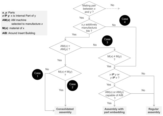 - Case 1: components are of the same material and are manufactured by the same AM technique (AM(x) = AM(y) and M(x) = M(y)). In such case, they are simply merged as a single component and their respective functional flows are combined.