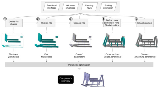 The goal that should, therefore, be sought is to find a product architecture, or an engineering bill of materials (eBOM) in case of redesign, which is minimal (while still functional)—that is, with the least separate components—and which is manufacturable with a single AM technique or with the least AM techniques. Besides, once the product architecture is minimized, a strategy must be retained for the way the parts will be designed to take advantage of the selected AM techniques’ characteristics. Our strategy is that, once the part’s functional interfaces (i.e., surfaces, lines, etc.) are identified, these are connected both to ensure structural integrity and a proper conveyance of the flows getting through the part, abiding by any design space and manufacturing constraints. Thus, AM-friendly parts’ geometries can emerge.