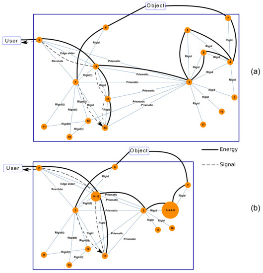 Product architecture showing part-to-part kinematic pairs along with functional flows: (a) initial architecture and (b) minimized architecture.