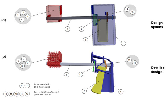 The generated minimal architecture has been used to designed the components’ geometries. A proprietary tool—the Pegasus CAD Assistant from Demoly et al. [2], was harnessed to semi-automatize the generation of the design spaces and the functional interfaces based on the kinematic relationships as shown in Figure 10a.