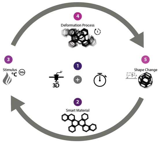 Over the last few years, a new term has emerged as 4D Printing (Four-Dimensional Printing), which utilises additive manufacturing methods to print stimulus-responsive products subjected to specific stimuli. It is generally regarded as the further evolution of 3D Printing. The 4D printing technology idea was first introduced by Skylar Tibbits, co-director and founder of the Self-Assembly Lab housed at the Massachusetts Institute of Technology (MIT’s) International Design Center [4]. 4D Printing adds the fourth coordinate of time and the traditional 3D coordinate. Therefore, it can regard 4D Printing as giving the printed structure the capability to change its form or function with time under external stimuli such as heat, water, UV light pressure and others [5]. The core elements of 4D printing technology are smart-material, which provides a more flexible, expandable, deformable characteristic of printed products to respond to specific stimuli. Moreover, 4D Printing is a progressive evolution of 3D Printed structures that can be changeable in terms of saved property and its functions over time [6].