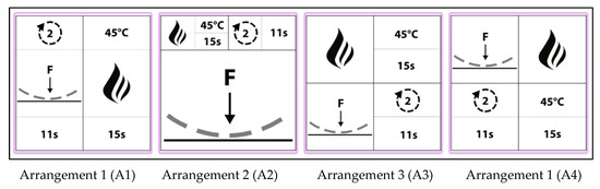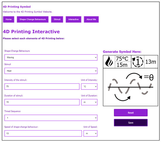 As part of this study, symbols are used to relay information between engineers and designers on the design aspect of 4D Printing. To use the 4D Printing graphic symbols, the researcher created a toolkit (website: https://symbols.ezrinazhar.com/, access on 27 December 2021 ) for designers and engineers to communicate with each other. The toolkit also shows the step by step on how to use the interactive part in the website. Figure 12 illustrates how all the elements of 4D Printing can be combined into symbols for 4D Printing.