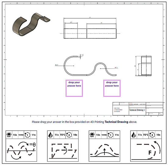 In addition, by adding the animated 3D parts, the researcher gives participants an idea of how the 4D printing part transforms. The participants can play the animation repeatedly to give them an idea of how 4D Printing is deformed. Then, participants were asked to match the 4D Printing symbols to the correct boxes provided in the technical drawing, as shown in Figure 6. Additionally, we envision conducting usability testing with the designer and engineer to assess and improve the design.