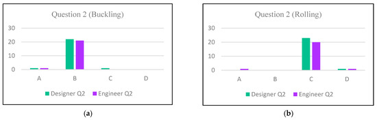 Next, Figure 8a,b shows the results from the second question in the ‘insertion task’. Participants need to answer the correct symbols for ‘buckling’ and ‘rolling’. There were tiny differences in participants answers. It means that the designer and engineer agreed and understood which symbol represented the 4D Printing shape-changes symbol for buckling and rolling.