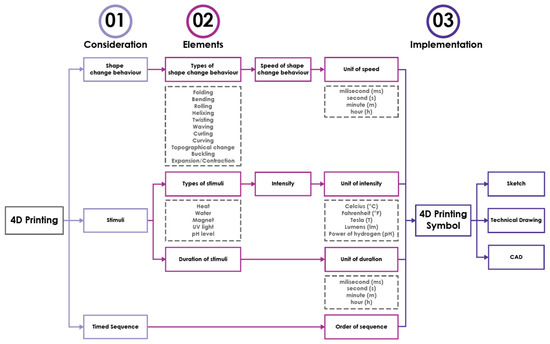 The second phase involves the key ‘elements’ similar to ‘consideration’. To be more specific, in this phase, we specified all the details of 4D Printing main elements. We divided it into nine variables to communicate the 4D Printing symbol. The first variable is the (type of shape-change), where we listed the 11 shape-changes of 4D Printing, which are folding, bending, rolling, helixing, twisting, waving, curling, curving, topographical change, buckling and expansion or contraction in the dotted line box. Then, we added the (speed of shape-change), speed here taken from where 4D Printing can change shape over time. To show the accurate deformation time of the shape-changes, we added another variable called the (unit of speed). The International System of Units (SI) contains the unit of time with a symbol to define millisecond, second, minute and hour.