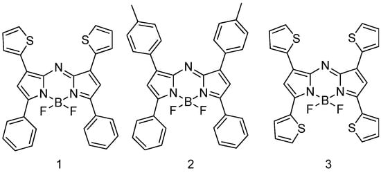 In this work, three aza-BODIPY dyes were studied, which were synthesized previously [,] and differ in their functional substituents along the periphery (Figure 1):