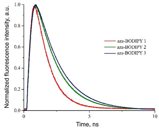 The fluorescence decay curves were recorded for the investigated compounds at the wavelength of the maximum fluorescence in various solvents (Figure 3). It was found that aza-BODIPY 1 had a narrower distribution compared to structural analogs 2 and 3.
