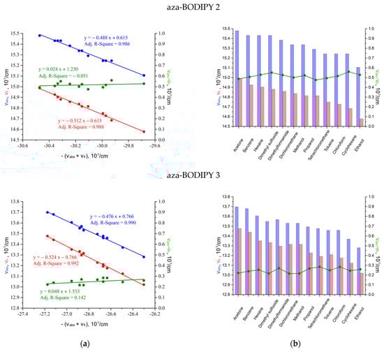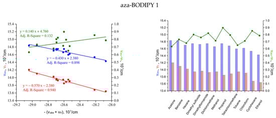 For a systematic analysis of the solvatochromism of aza-BODIPYs, a new semi-empirical approach was used, developed by the senior researcher of the laboratory, Felix Telegin, which was based on the theories of Lippert–Mataga, Bilot–Kavski, Bakhshiev, Liptey, and their special cases []. The solvatochromic sensitivity of the dye to the microenvironment can be estimated from the equation for changing the position of absorption and fluorescence bands in a series of solvents: