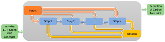 Schematic representation of the steps (blue box) within the production line (grey box) that have been identified, along with list of inputs (orange box) and outputs (yellow box). Outside the production line, the framework identifies which concepts from Industry 4.0 and green manufacturing (left, green box) should be introduced and how they will impact on the carbon footprint (right, green box) once they have been introduced in the production.