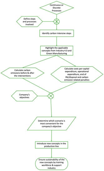 The strength of this framework is its applicability regardless of the industrial sector, the type of process (discrete or continuous) and the objectives of the company. The framework is based on identifying the carbon intensive parts of its production line and calculating the related carbon emissions based on the energy consumed for their operation. Then, the concepts from Industry 4.0 and green manufacturing that are applicable to the specific case are identified, and information regarding their energy demands and costs are collected. In the case of multiple steps being carbon intensive, then different scenarios are identified, including the different approaches in all possible combinations. After the costs and carbon emissions of these scenarios are calculated, it is up to the industry to determine the metrics that will allow them to go for the best option to fit their needs. Hence the applicability of the framework is not only on the different industries that can use this approach, but it also applies to the different objectives that the companies have at a given time.