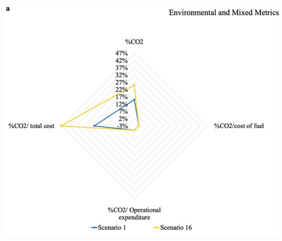 Radar charts for the percentage differences between the scenarios and the reference case, for carbon emissions, carbon emissions per cost of fuel, carbon emissions per operational expenditure and carbon emissions per total cost, with (a) scenarios using only digital tools (Scenario 1) or only energy efficient approaches (Scenario 16); (b) scenarios using digital tools in three out of the four cases and energy efficient equipment in the fourth (Scenarios 2, 3, 4 and 5); (c) scenarios equally implementing digital and energy efficient solutions (Scenarios 6, 7, 8, 9, 10 and 11); (d) scenarios where energy efficient equipment is the dominant approach (Scenarios 12, 13, 14 and 15).