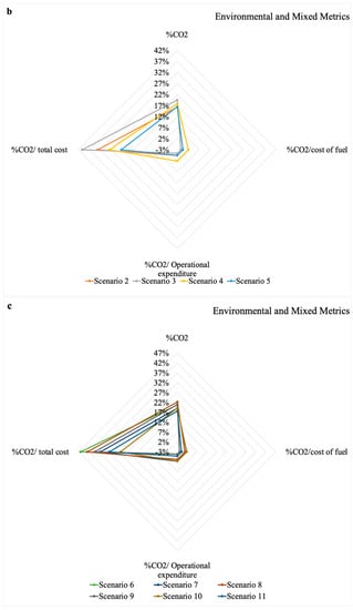 Since the cost of the emission trading system is proportional to the carbon emissions, this metric shows no difference in its percentage representation. On the other hand, when the denominator of the metric is the total cost, this is when the changes are most obvious, ranging from 22.45% (scenario 5) to 48.52% (scenario 12), both of those are mixed scenarios. Scenario 5 includes mostly digital solutions, apart from purchasing energy efficient burners, while scenario 12 includes mostly energy efficient equipment, apart from digitalizing the meltshop burners. The meltshop burners have low carbon emissions, while the total cost for its digitalization is one of the lowest, and the total cost for the energy efficient ladles is the lowest.
