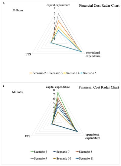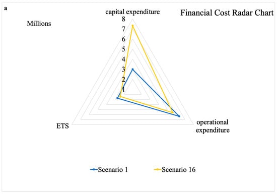 Radar charts for the absolute value of capital expenditure, operational expenditure, and cost of the emission trade system, with (a) scenarios either using only digital tools (Scenario 1) or only energy efficient approaches (Scenario 16); (b) scenarios using digital tools in three out of the four cases and energy efficient equipment in the fourth (Scenarios 2, 3, 4 and 5); (c) scenarios equally implementing digital and energy efficient solutions (Scenarios 6, 7, 8, 9, 10 and 11); (d) scenarios where energy efficient equipment is the dominant approach (Scenarios 12, 13, 14 and 15).