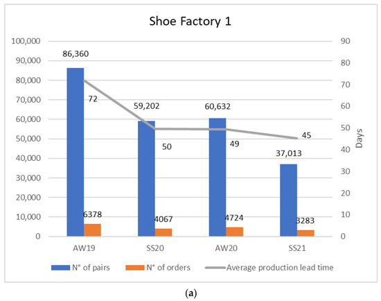 Shoe factories—seasonal N° of pairs, N° of orders, and average production lead time, considering AW19-SS20 seasons (a) and AW20-SS21 seasons (b).