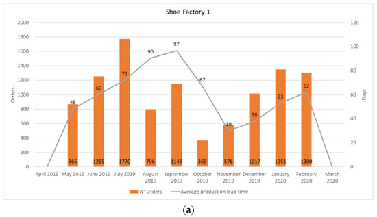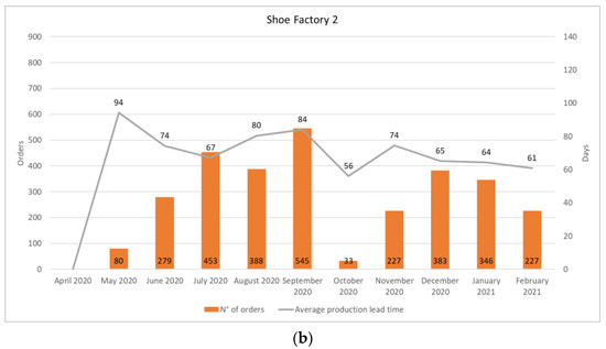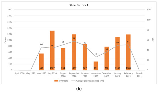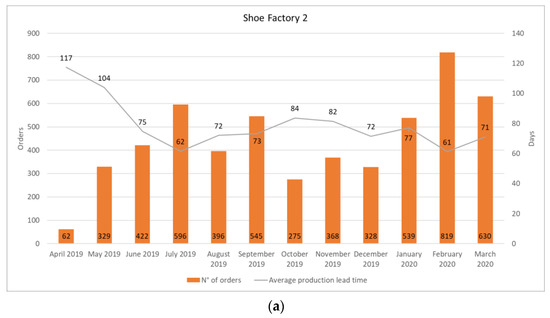 Shoe factory 2—monthly average production lead time, and N° of orders, considering AW19-SS20 seasons (a) and AW20-SS21 seasons (b).