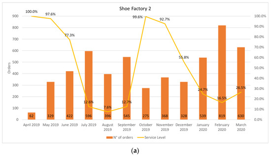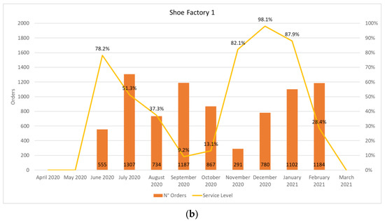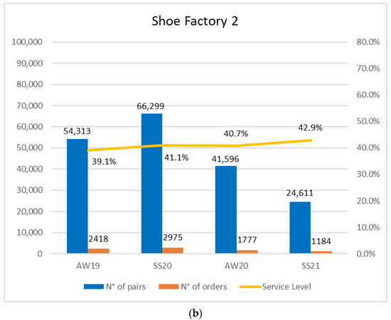 Figure 5 shows the seasonal trend of orders, the number of pairs produced, and the Service Level of SF1 (Figure 5a) and SF2 (Figure 5b).