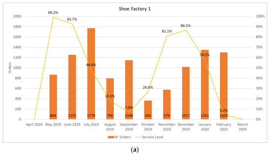 Shoe Factory 1—monthly service level and N° of orders, considering AW19-SS20 seasons (a) and AW20-SS21 seasons (b).