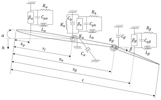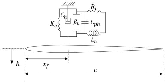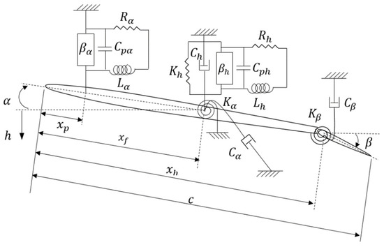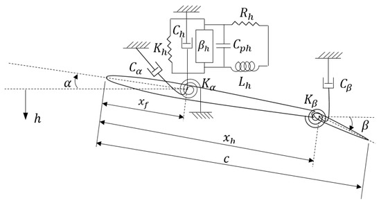 A linear 2D smart wing which has plunge, pitch, and control degrees of freedom is shown in Figure 10. The model contains an airfoil with a piezoelectric patch in the plunge DOF, called piezo-plunge-wing. The system has the plunge, pitch, and control DOF indicated by , , and , respectively. The DOF represents the angle of the control surface around its hinge, located at distance from the leading edge, and denotes the stiffness of the control surface.