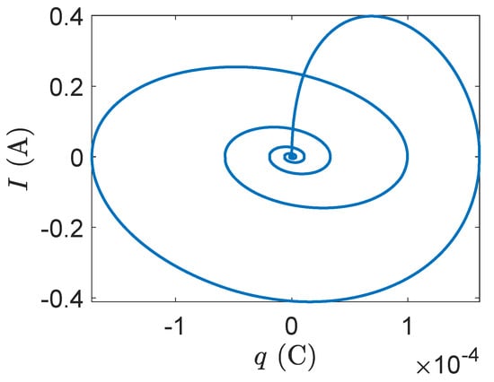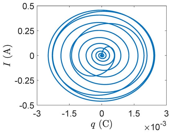 Likewise, the phase plane for the electrical current and charge begins at the initial conditions for the electric charge and current, which are zeros, and it twists out counterclockwise until reaching the maximum values. The trajectory then turns towards the start point , as depicted in Figure 4.
