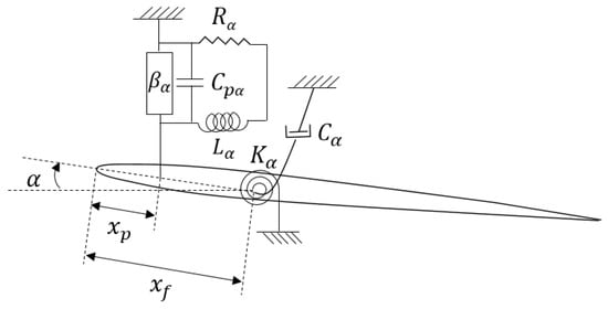 where , , , , , , , , , , , , , , , , , , , , , and are defined as in Equation (1), is the pitch inductance of piezoelectric material, is the pitch resistance of piezoelectric material, is the pitch capacitance of piezoelectric material, is the pitch electromechanical coupling, and is the pitch electric charge. The pitch electromechanical coupling, , depends on the pitch coupling coefficient, , and the pitch capacitance, , and it can be calculated by .