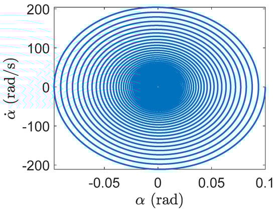 In addition, the phase plane plot for the pitching velocity and angle has been shown in Figure 7, where the point evokes the system trajectory. The initial pitching angle and velocity is the start point of the smart wing trajectory at the far right and the trajectory is turning to the fixed point, , where the center of the phase plane is .