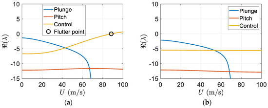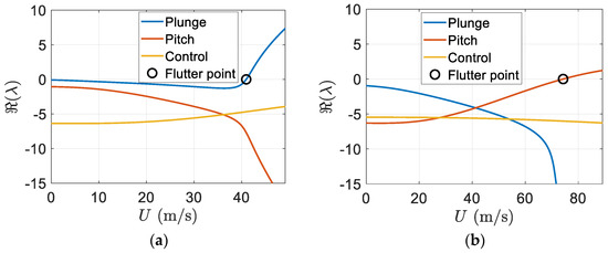 In addition, the real part of eigenvalues versus the freestream velocity is shown in Figure 12. Again, Figure 12b indicates flutter appears in the pitch mode. There is an effective increase in the flutter speed of the smart wing in comparison to the regular wing.