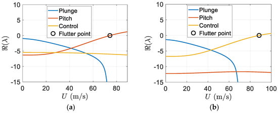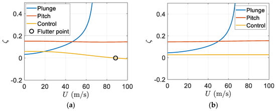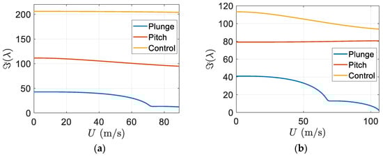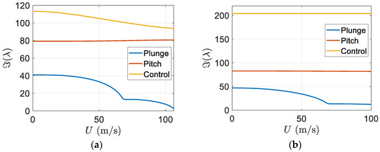 Furthermore, the imaginary part of eigenvalues versus the freestream velocity is depicted in Figure 13. Figure 13b shows that flutter appeared in the pitch mode and there was an effective increase in the flutter speed of the smart wing in comparison to the regular wing.