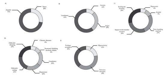 Main psychological problems during COVID-19 lockdowns. (A) China [2]; (B) United Kingdom [3]; (C) Spain [4]; (D) USA [5]; (E) Mexico [6]. Own elaboration from the data of the texts [2,3,4,5,6], 2021.