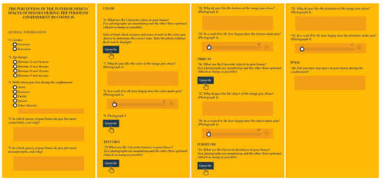 In the first part of the survey, users must answer three general information questions: (1) Gender (female or male); (2) Age range (25–34 years; 35–44 years; 45–54 years; or 55–64 years); (3) Who do they live with during lockdown? (Alone, roommates, family, spouse, or other). The second part of the survey indicates spaces where the respondent feels most comfortable or uncomfortable and the reasons for those feelings. The third section of the survey corresponds to the concept of color. In this section, respondents must upload two to five photographs of his or her favorite colors (which should be found in the space where he or she lived in during lockdown). Subsequently, they had to explain why they chose these colors and, on a scale from zero to ten, define how much they liked them. The survey could be answered via WhatsApp or by taking the pictures, saving them on a computer, and answering the survey from there later. This process is repeated three more times as people could share up to five colors (Figure 2).
