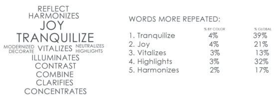 The next part of the graph corresponds to the word cloud itself. It is formed with the most repeated words of answers to open questions. The most cited words appear in a larger size. The next part of the graph is a list of the 5 most repeated words for the color. Two columns follow, one column corresponds to the percentage of people who repeated that word to define the color and the other column shows the percentage of people who used that same word (Figure 4).