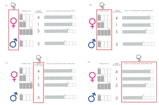 The last section of the graph is divided into four parts. In the first one, we can see symbols corresponding to the respondent’s gender (Figure 5A). In the next column, rectangles colored in gray represent age (Figure 5B). Then we can see a column with the number of people who sent that color (Figure 5C). And finally, the percentage of how happy that color makes the respondents is shown on a scale from 0 to 10 (Figure 5D).