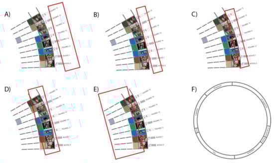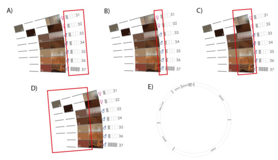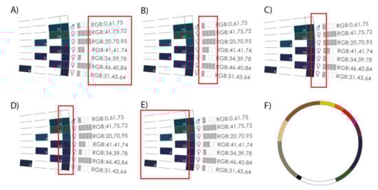 From outside to inside, the chromatic circle shows the RGB code of different hues (Figure 6A). Next, the age ranges are represented by four rectangles. Depending on the age of the person the rectangles will appear gray, for example, if the person is in the range of 25 to 34 years only the first rectangle will be gray (Figure 6B). Next, the respondent’s gender is shown reduced to the binary standards female or male (Figure 6C).