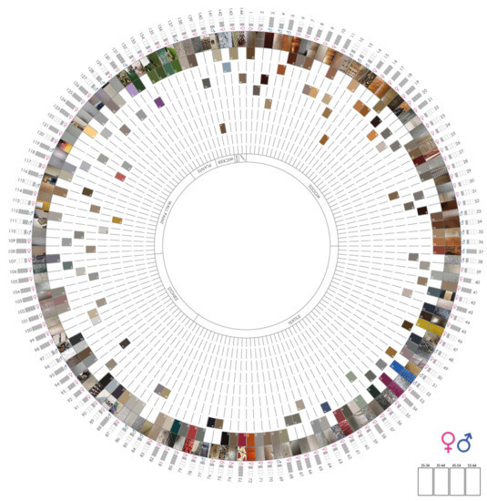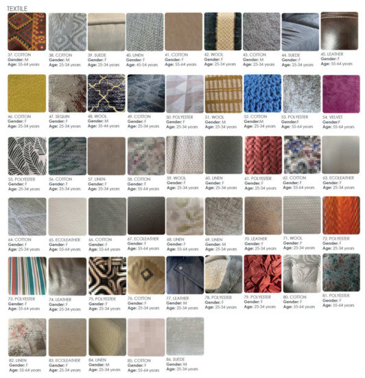 - Description: Survey software provides its results in a spreadsheet. Table 2 shows a part of the table corresponding to the initial questions and those related to color and texture from one feminine respondent between 45–54 years old. Numbers in cells correspond to Likert Scale where ten is the highest rating and zero is the lowest. Images were saved in a separate folder, referencing them with respondent’s number.